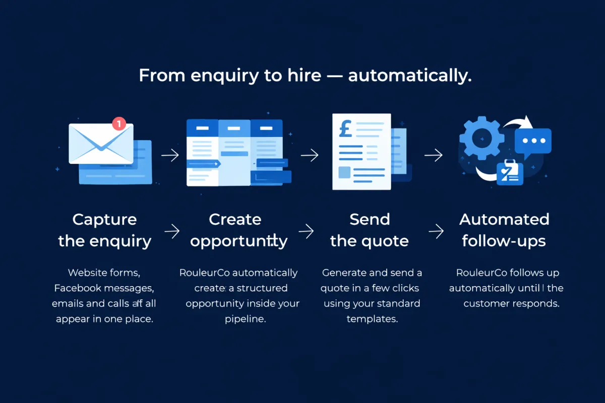 RouleurCo is designed for rental companies running busy hire desks — where enquiries arrive from multiple channels, quotes need sending quickly, and follow-ups often get missed.